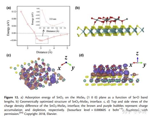 显示电子结构的一种流行形式是从DFT计算获得的电子/电荷分布。电荷分布图清楚地显示出电极材料的电子结构和原子的化学环境,这很难通过实验测量。赵等模拟了片状MoSe2-SnO2界面并计算了界面的电荷密度(图13)。通过从MoSe2-SnO2界面的电荷密度中减去MoSe2和SnO2的各个电荷密度,可以计算出MoSe2-SnO2界面的电荷密度差。图12c,d示出了SnO 2吸附在MoSe 2上之后电子的转移。MoSe2表面上的原子失去电子,这些电子向O转移SnO2的原子数增加,并且表面上Se和O原子之间的电荷密度增加,这对应于Se和O之间的化学键的形成,这在图13a中也得到了证明。当电子离开原子核时,电子对原子核的约束减弱,因此电子的迁移率显着提高。因此,通过掺杂SnO2可以显着提高MoSe2的电子电导率,并且片状MoSe2-SnO2在SIBs中显示出高倍率容量。