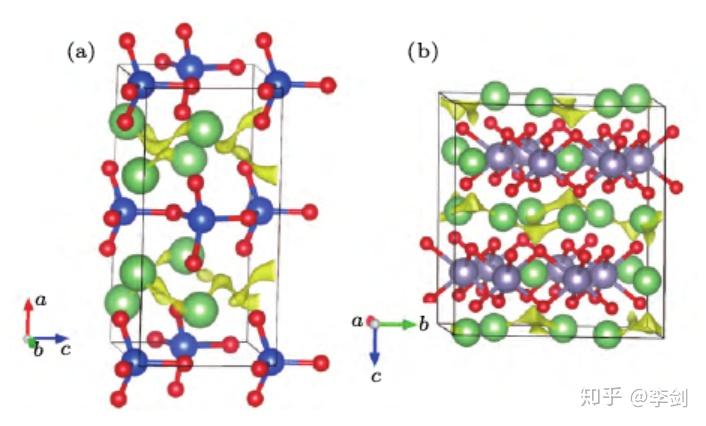 图57 用键价方法计算得到的(a)Li2SiO3和(b)Li2SnO3的离子输运通道