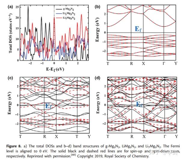 在固态物理学中,电子能带结构提供有关固体罐中电子占据的能级范围的信息,并且带隙与电子导电性密切相关。从最近的DFT研究中,Xiong等人预测,由于Mg3N2具有稳定的结构和较高的理论容量,适当的嵌入电势以及较低的离子传输势垒,因此它是锂离子电池潜在的高性能阳极材料。图9显示了原始和锂化Mg3N2材料的DOS和能带结构。他们的计算表明,原始的Mg3N2的带隙仅为0.91 eV(PBE),表明它是半导体。在嵌入锂离子之后,中间体LiMg3N2和最终产物Li7Mg3N2是没有带隙的金属,这意味着锂化过程增强了Mg3N2的电子导电性。由于PBE官能团倾向于低估带隙,因此HSE06杂合官能团已用于重新计算带隙。正如预期的那样,Mg3N2的HSE06带隙为1.92 eV,比PBE高约1 eV。但是,锂化的Mg3N2物质即使具有HSE06功能,也已证明是金属的。基于这些电子结构分析表明,Mg3N2在循环过程中具有良好的电导率和良好的倍率容量。