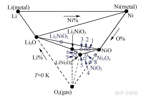 Wang等计算了LiXCoO2、LixNiO2、LixMn2O4材料在不同含Li含量下的热力学相图,阐明了这三种材料的分解机制。以LiNiO2为例,wang等计算了改材料在0K、220K、730K的Li-Ni-O2三元相图(图5)。通过分析相图中LixNiO2稳定存在的区域及分解经过的区域,认为LixNiO2的分解是通过层状向尖晶石相的放热反应和尖晶石向岩盐相的吸热反应两步来实现的。
