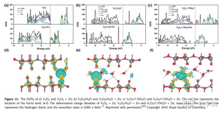 最近,Wu等人报道了关于双层结构的V2O5•nH2O作为水性ZIBs阴极材料的研究,他们研究了通过电荷密度分布和DOS嵌入Zn2 +的V2O5•nH2O的电子结构。图14显示了原始和Zn2 +插入的V2O5•nH2O结构的DOS计算值和变形电荷密度。对于没有键合H2O的V2O5,大量电子从Zn转移到相邻的V和O。但是,在键合H2O的情况下,例如V2O5•H2O,电荷转移方向发生变化。除了从Zn移动到V和O外,电子主要在Zn和H2O之间交换。通过比较V2O5·H2O的DOS的变化,可以证实该结果,表明DOS在Zn2 +嵌入后移动到较低的能量区,表明Zn的电子转移到导带。为了量化转移电子的数量,作者计算了Bader电荷,结果表明,在V2O5中,V吸收了大部分源自Zn的电子,而在V2O5•H2O中,电子主要移动到H2O的氧原子上。和V2O5•1.75H2O。因此,键合的H2O对ZIBs中V2O5•nH2O的电化学性能具有重要影响。