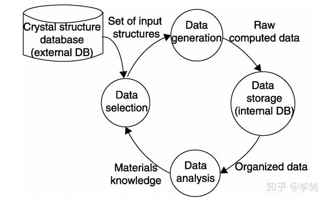 上述研究工作中所用到的高通量计算方法都具有图1所示的共同特点。首先从外部的结构数据库中选择数据,产生可被计算软件调用的输入文件,并进行计算得到材料相应的性质数据,运算结果保存到数据库以备进一步的分析,获得的新知识可扩充原先的数据库并有助于更为准确的数据选择。由此可见,形成并完善一套程序化的高通量计算流程" 把各种计算软件包、编写的单一功能的计算程序或指令(如输入文件生成& 、材料性质模拟、结果分析程序等)和计算硬件设备等关联起来,使得整个过程能够自动完成,是实现高通量计算提高整体效率的关键。上面提到的由Curtarolo等人设计的ALFOW和由Cedre小组设计的计算流程均实现了晶体结构数据库与第一性原理计算程序VASP的自动调用功能,从而通过高通量计算获得材料的形成能等热力学数据以及电子结构的信息。但由于筛选不同类型的材料时所关注的性质往往是不同的,希望调用的材料数据库、模拟方法、分析方法都可能有所变化,所以针对各种不同的材料还需设计相应软件以实现特定的自动化运算流程。