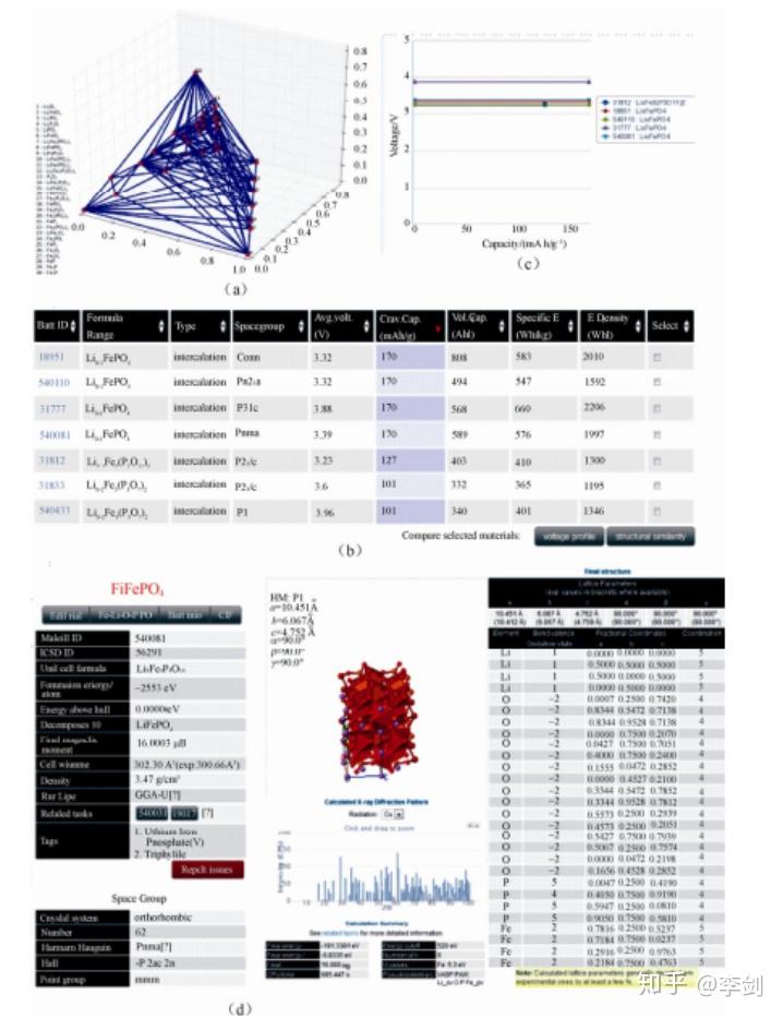 图52 Li-Fe-P-O 的(a)相图;(b)平均电动势在 3~4V,容量>100mA·h/g 的复合物数据库;(c)电压曲线;(d)540081(LiFePO4)的详细信息( http://www. materialsproject ·org)