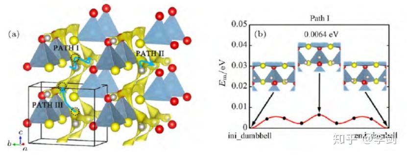 图59 (a)采用高通量晶体结构预测算法得到的含锂氧硫化物LiAlSO的晶体结构;(b)密度泛函计算得到的锂离子在该结构中的输运势垒