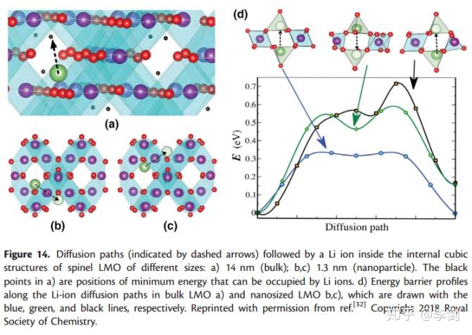 Velasquez等人报道了当LiMn2O4的纳米颗粒尺寸小于特定尺寸(~15nm)时,LMO的尺寸越小,电池性能越差。这种现象在LIB中是恰恰相反的。为了解释这种现象,采用DFT+NEB的方式来研究。计算了尖晶石结构中在不同尺寸下的能量势垒(见图21)。图14(d)中三个不同方向的Li的能量势垒揭示了相关的结果。结果显示在体相LMO中Li离子的最大扩散势垒为0.33eV,而在纳米颗粒中(图22,d)存在两条可能的Li+扩散路径,分别是0.59eV和0.72eV。DFT计算结果显示,随着尺寸从14nm到1.4nm变化,对应的能量势垒从0.33eV逐渐增加到最少0.59eV。一系列的计算结果显示随着材料尺寸的减小,为嵌锂和脱锂造成了阻碍,进而导致电压升高。