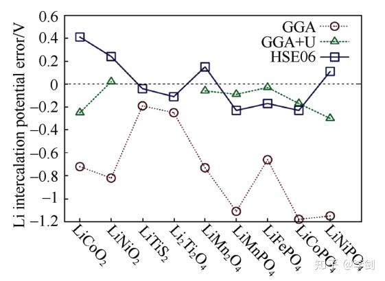 研究早期人们发现,几乎对所有的正极材料,密度泛函理论计算得到的电压都偏低。Zhou等认为这是由于含有3d过渡金属离子的正极材料属于强关联电子体系,其3d轨道的电子是高度局域化的。而在单电子近似的密度泛函理论框架下,局域化的电子会引入自相互作用,因此导致嵌锂电位被低估。通常对标准的GGA进行+U修正,也即GGA+U的方法,或采用杂化泛函HSE06,计算得到了与实验值更为接近的电压(图4)。在含有3d过渡金属离子的氧化物正极材料计算中强关联效应已经公认为需要考虑的效应。