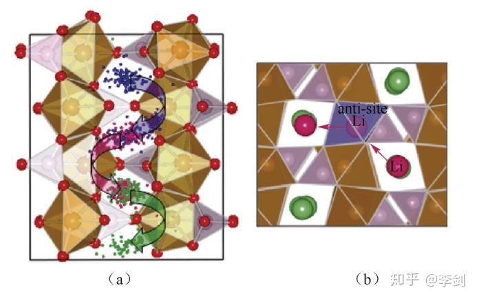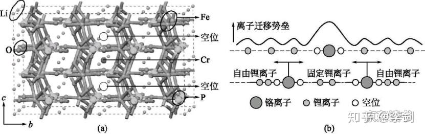 图17 LiFePO4结构模型(a)和锂离子迁移阻塞机理示意图(b)