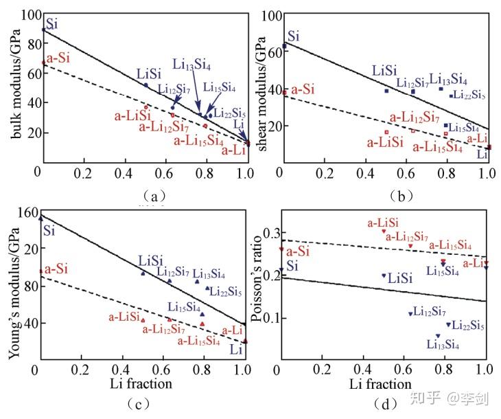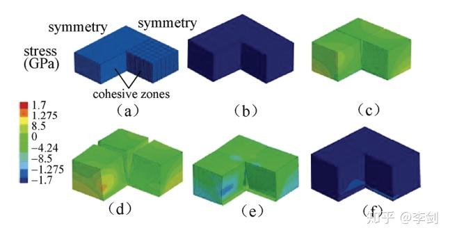 锂离子电池中还有很多现象可以通过相场模拟获得进一步的认识。如在纳米硅负极材料的充放电过程中伴随着材料体积膨胀,会导致黏结剂的脱落,SEI重新生成和容量衰减,Zuo等通过相场模型研究硅薄膜在嵌锂过程中力场分布以及裂纹的演化过程。