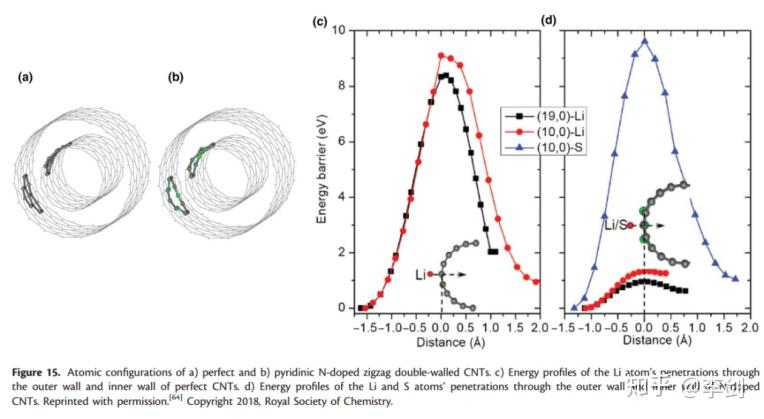 Wang等人最近研究了LSB电池中对CNT的N掺杂,比较了N掺杂CNT与本征CNT的迁移势垒。他们研究了Li+在外表面、内表面以及内部空间的扩散。对于完美的CNT,其扩散势垒分别是8.4和9.1eV,而对于N掺杂的CNT,其扩散势垒分别为0.95和1.33eV。完美CNT比N掺杂的要高。进一步分析表明是因为较高的能垒导致S原子被封装在CNT中。这也揭示了N掺杂的CNT可以作为未来潜在的高性能的LSB电池正极材料。