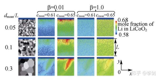 Yamakawa等通过相场方法模拟层状正极材料LiCoO2不同晶粒大小、不同晶粒取向对Li+扩散的影响。下图所示为模拟得到的在恒流放电时LiCoO2中Li浓度的空间分布。显示出Li+的扩散对晶界、晶体方向的空间分布及晶粒的尺寸都十分敏感。