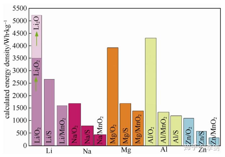 图3 不同金属负极的M/O2、M/S、M/MnO2等电池的理论质量能量密度比较