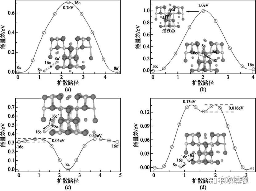 图18 锂离子在Li4-δTi5O12(a),Li4+δTi5O12(b),Li7+δTi5O12(c),Li7-δTi5O12(d)晶格中的扩散路径和势垒