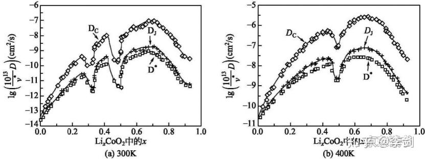 第一性原理计算可以精确地计算一些具有代表性原子结构的能量,然后通过集团展开方法拟合出能量与结构参数的一般表达式,从而获得所有可能结构模型的能量;然后通过蒙特卡洛模拟技术模拟锂离子在各种复杂材料中的扩散和输运性质。通过第一性原理计算获得的能量表达式比经验位能模型能量要准确,同时对于结构复杂难以建立检验模型的体系,也可以比较方便地获得结构能量。Ceder小组发现了锂离子在LixCoO2中的双空位扩散机制,得到的锂离子扩散系数如图16所示。