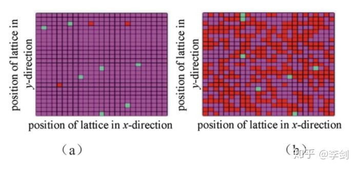 蒙特卡洛模拟优势在于模拟体系可以很大,甚至可以直接模拟真实材料大小的体系。Ouyang等在模拟LiFePO4材料中Cr对Li离子输运的阻塞效应时采用了尺寸为1000*1000*1000的晶胞,模型尺寸和实际LiFePO4材料颗粒尺寸在同一个数量级上,计算模型和阻塞见图17。另外,蒙特卡洛模拟还可以比较方便地模拟在外场作用下的离子输运。比如,在外加电场中,锂离子受到电场作用,从一个位置迁移到另外一个位置将增加一项额外电场能,而电场能可以算入迁移率Ps表达式中。这样模拟结果就代表了锂离子在外场中的迁移情况。