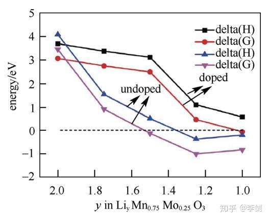 为改善富锂锰基材料xLi2MnO3·(1-x)LiMO2(M=Ni、CO、Mn等)正极材料充放电过程中因为氧析出导致的结构不稳定,包覆和掺杂通常成为必要的手段。理论计算方面,Gao等通过第一性原理计算了不同晶格位Mo掺杂Li2MnO3晶体的结构稳定性及Li+在晶格中不同跃迁方向的迁移势垒。图7是采用PBE+U交换关联势计算得到的不同脱锂态的LiyMnO3和LiyMn0.75Mo0.25O3的氧气释放过程中反应焓和吉布斯自由能。分析图6可知,与未掺杂的Li2MnO3相比,掺Mo的Li2MnO3结构稳定性有了大幅度提升。