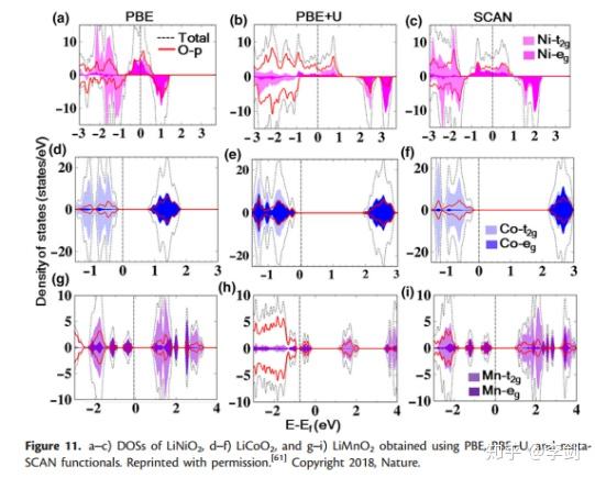 DOS可用于计算电子占据状态,并且Chakraborty等采用了SCAN meta-GGA密度功能计算层状过渡氧化物(包括LiNiO2,LiCoO2和LiMnO2)的结构,磁性和电化学性质,这是用于LiBs的商业阴极材料。在图12中对这些化合物的DOS进行了比较,结果表明Ni,Co,Mn-d和O-p状态具有独特的杂交,表明过渡金属原子与氧原子之间的牢固结合。此外,金属d态对费米能级附近的价带有重要贡献。此外,LiNiO2中的Ni3 +和LiCoO2中的Co3 +处于低自旋状态(t2g 6(|↑↓|↑↓|↑↓|),例如0(| | |)),这意味着向上和向下向下的t2g自旋通道被完全占用。相反,LiMnO2中的Mn3 +处于高自旋状态(t2g 3(|↑|↑|↑|),例如1(|↑| |))。将基于meta-GGA功能的结果与使用PBE + U和PBEfunctionals获得的结果进行了比较。从他们的比较中,我们可以看到PBE + U官能团低估了费米能级附近的金属d态的能量,而SCAN提供了更准确的预测,而PBE + U倾向于高估了O-p态的能量。