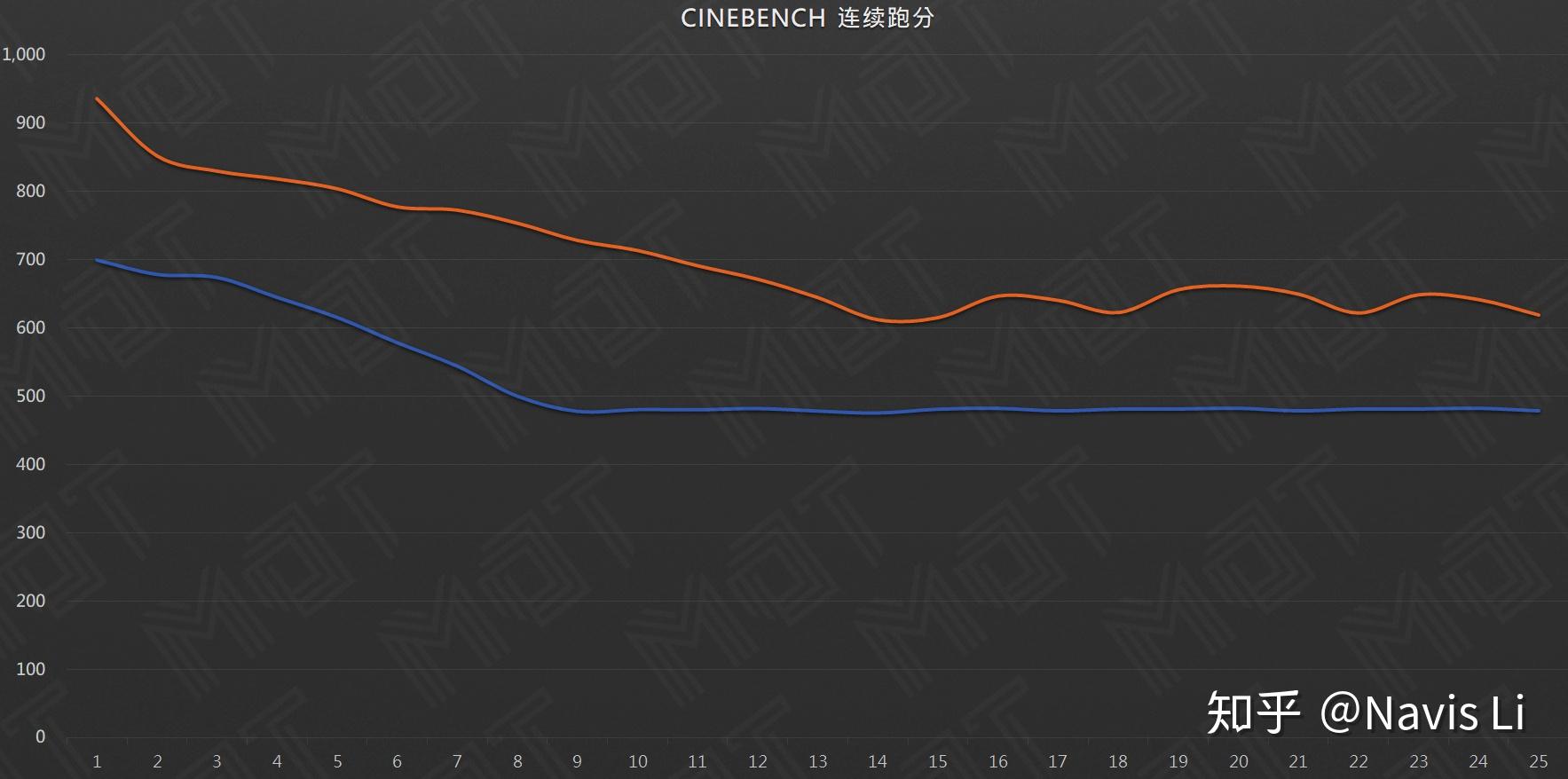 可以看出性能模式下 C740 会由一开始的 950cb 级别慢慢下降,最终在 15 次测试之后开始波动在 620~660cb;而冷静模式则是有一开始的 700cb 慢慢稳定在 480cb 的水平。