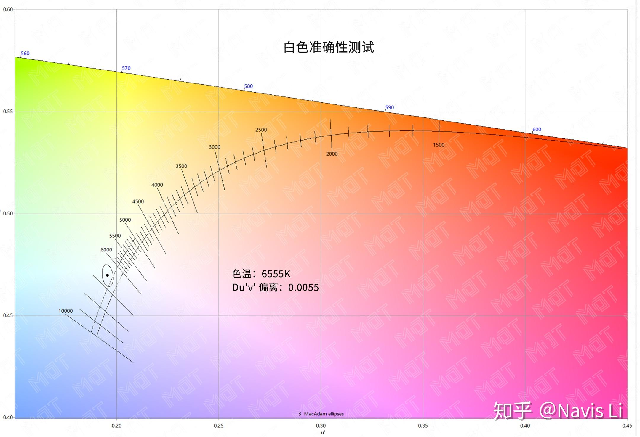 相对于普通屏幕测试只测色温,MDT 将 Du‘v‘偏离离加入屏幕白点准确性测试环节,因为传统的色温测试只能反映一块屏幕的冷暖而不包括发绿或者发紫,一块明显偏绿的屏幕也可以是 6500K 标准色温,而通过 Du’v‘ 偏离就能反应屏幕还有没有单纯通过色温无法衡量的偏色。