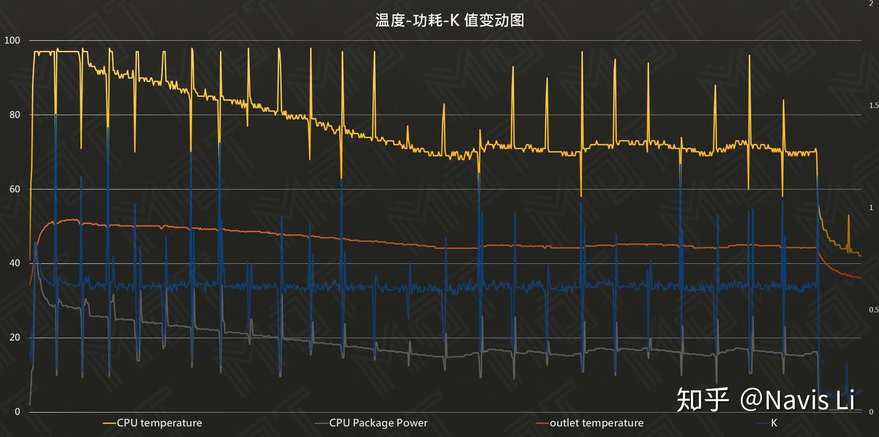 这一次我们也加入了之前引入的一个新的监测点, 那就是机身出风口的温度,可以从上图中的 air outlet-temperature(也就是橙色线)来看到 ,这也是用来辅助判断一个机器的散热系统散热效率的因素。