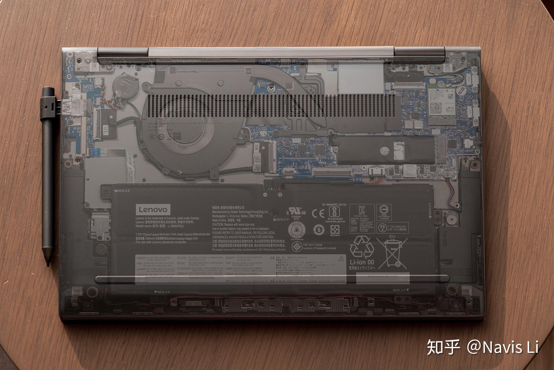 左上角(机身右侧)的接口为大小板转接,在小板和风扇中间留有了比较大的空袭,空间利用率没有旗舰那么高,不过电池也已经有了 51Wh, 各个方面倒是没有什么缩水。