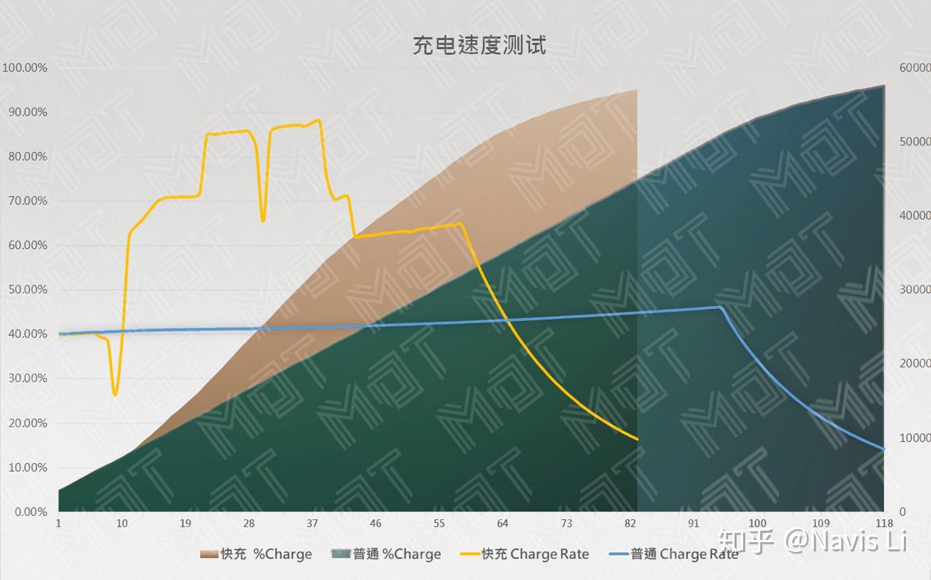 而在充电速度方面,C740 可以选择快充和普通两种模式,MDT 也分别测试了两种情况下的充电速度,黄色是快充模式,期间最高充电功率达到了 50W 以上,只需要 35 分钟就可以从 5% 充至 50%, 最终 82 分钟充满。