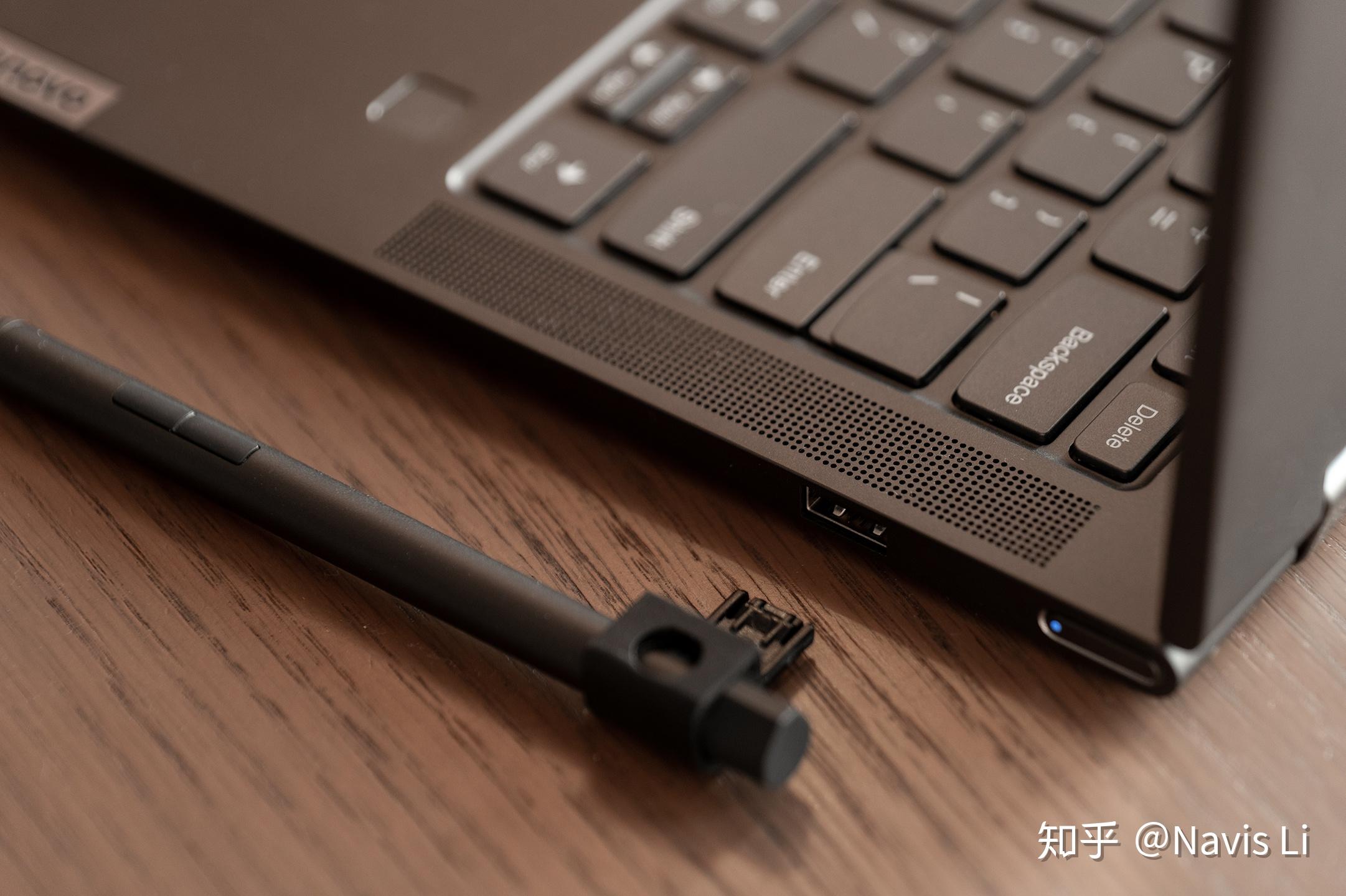 但有一点我们必须要提到,那就是 C740 并没有在机身内部设计放置触控笔的空间,而是提供了一个固定用的配件,可以插在机身的 USB-A 接口上,通过这样的方式固定触控笔。说实话,尽管这么放的时候我随身带着走也没有丢或者弄坏,但是给人心理上的感受确实是不太牢靠,这可能也是 C740 设计上的最大的槽点。
