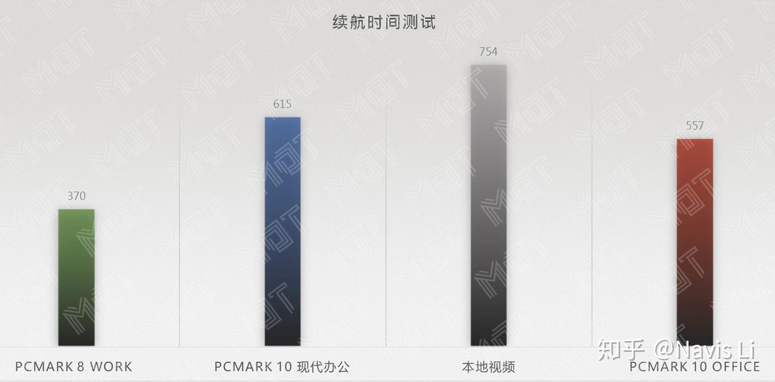 MDT 继续通过常用的 4 种模式来测试续航,覆盖了日常工作中常用的几种场景,包括 PCMARK 8 Work 这样的中度使用场景,PCMARK 10 Office 和现代办公这样的轻度负载使用场景,以及本地视频播放这样的最轻度续航测试,最终汇总成如上图所示的结果。