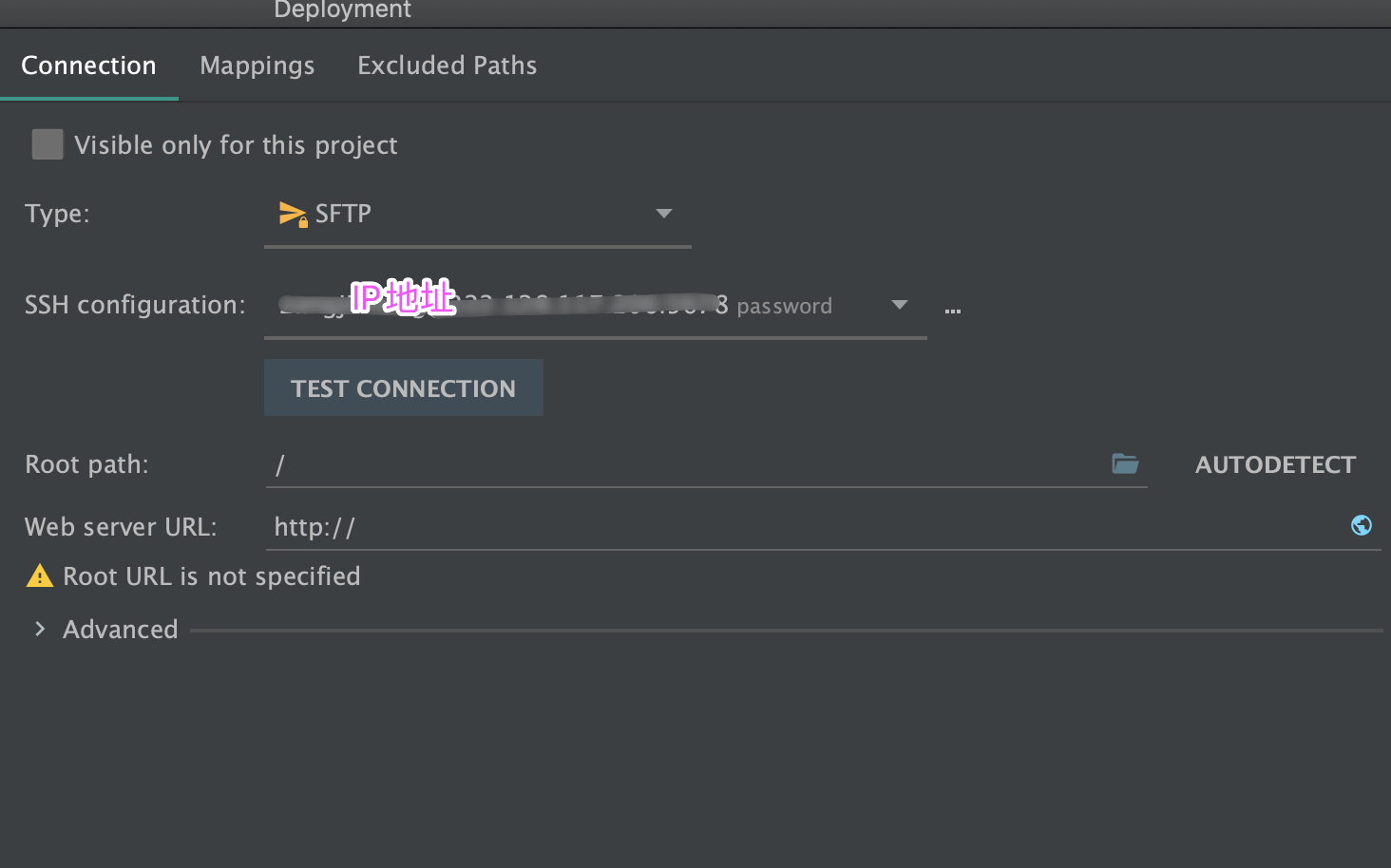 - 填写远程端的ip地址,Type为SFTP模式,项目路径,完成点击确认。