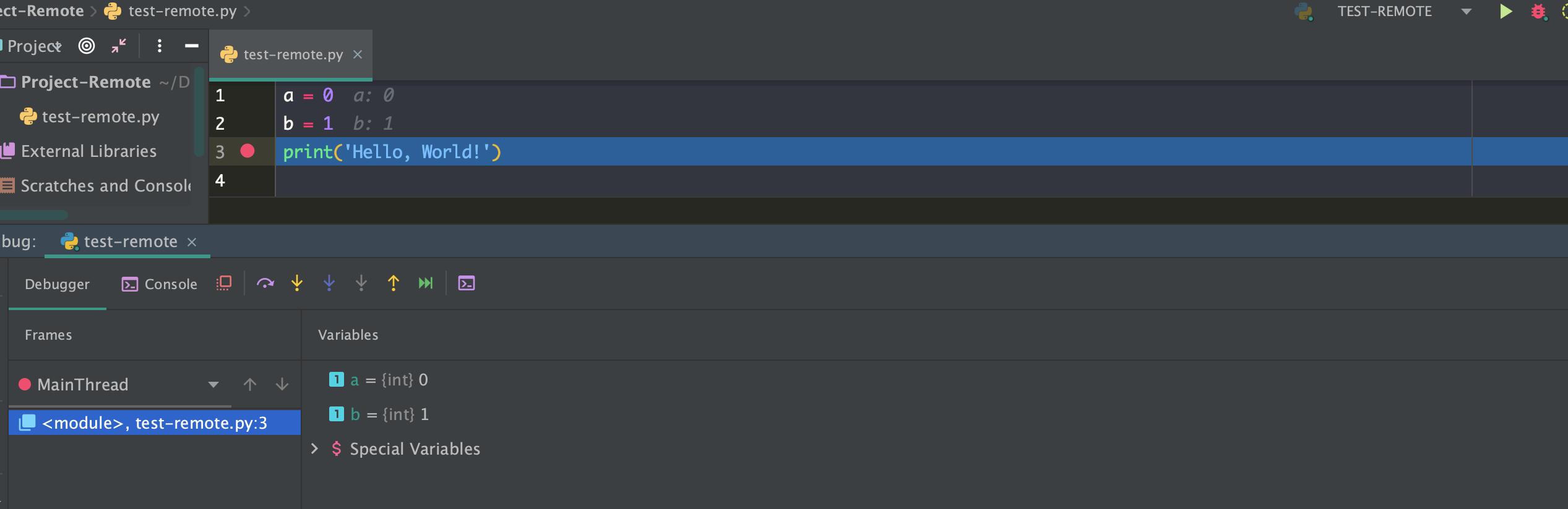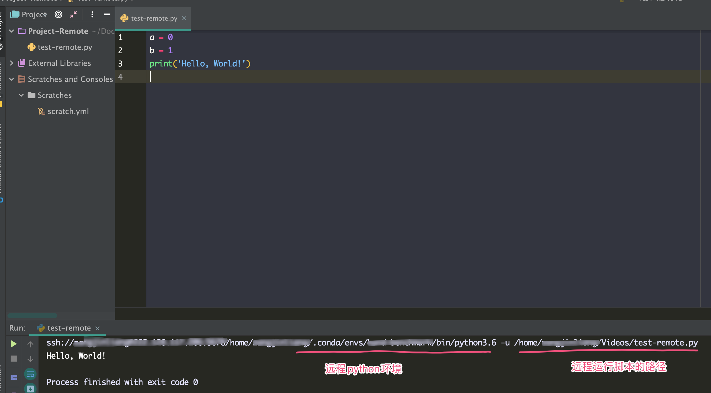 - 同步文件后在本地端运python代码,可以看到是在远程环境下运行文件。