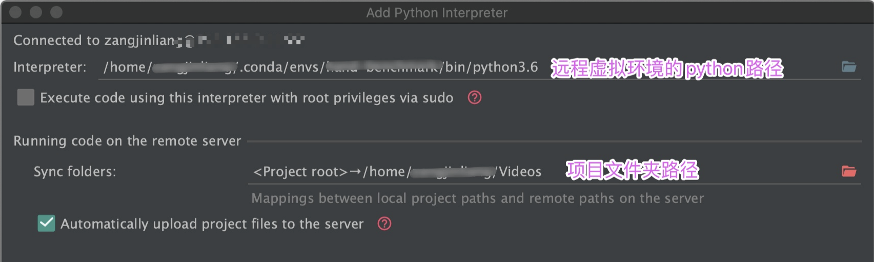 这里需要记录下项目的路径,以及conda的python路径,在Linux系统下anaconda的虚拟环境一般会在当前用户目录下,例如:
