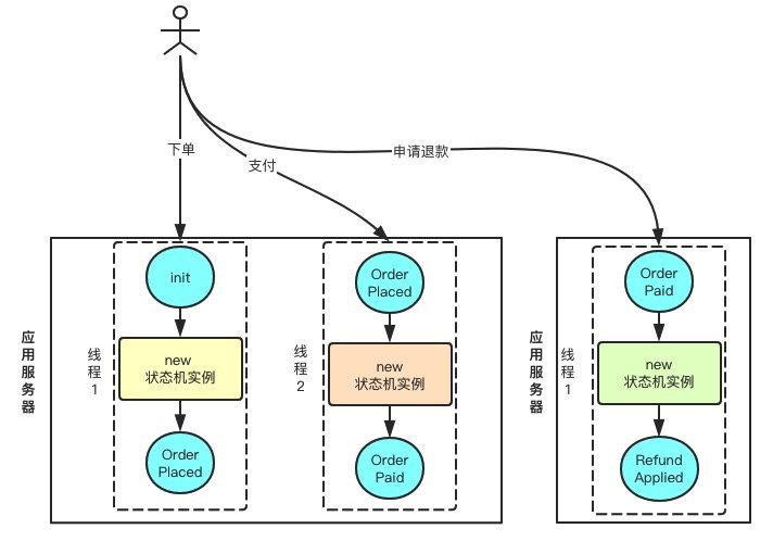 - 状态机本身需要是Stateless(无状态)的,这样一个Singleton Instance就能服务所有的状态流转请求了。
