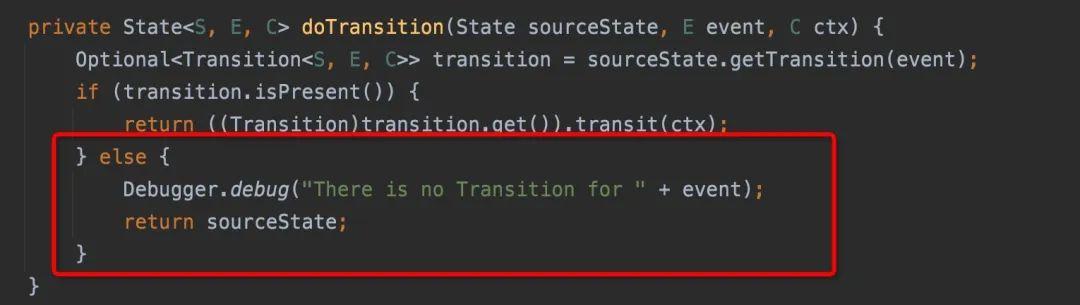 可以看到,当checkConditionFalse()执行时,永远不会满足状态流转的条件,则状态不会变化,会直接返回原来的STATE1。相关源码在这里: