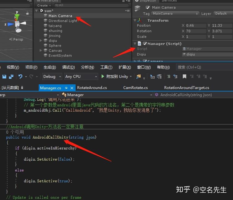 UnityPlayer.UnitySendMessage("Main Camera", "AndroidCallUnity", "");