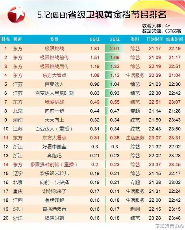 “千呼万唤始出来”的《极限挑战》第五季,终于在5月12日晚播出了。根据CSM 55城数据,《极限挑战》第一期的55城收视率1.81,35城收视率2.01,在昨晚黄金档节目中排名第一。对于《极限挑战》来说,整季节目围绕“长江行”这样一个大主题是第五季的创新之举。