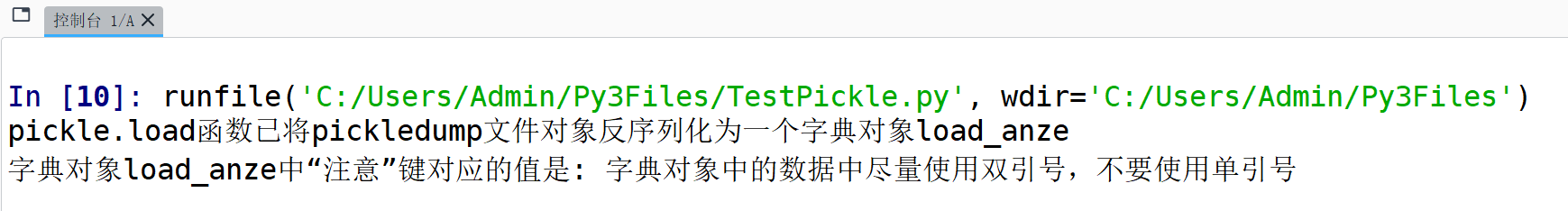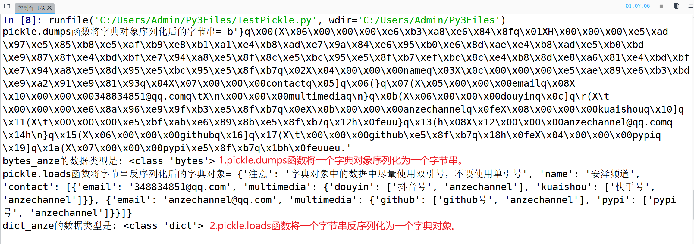 print('pickle.loads函数将字节串反序列化后的字典对象=', dict_anze)