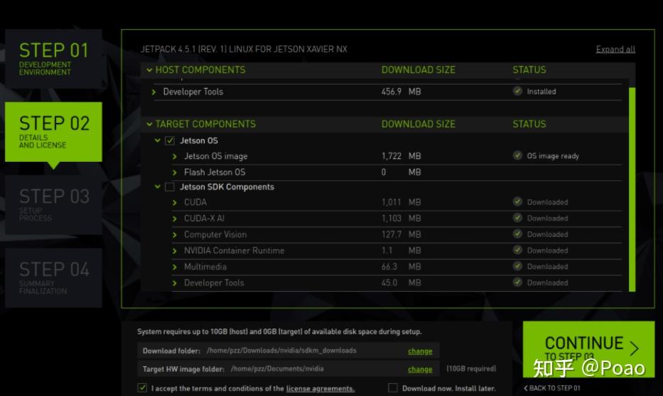 第二步就需要 选择是否安装相关的组件包 。我之前给其他板子安装过,所以这些依赖包都已经下载好了,界面下方可以选择组件包在该Ubuntu下的存储位置。同时,因为默认情况下系统将会被安装到xavier的emmc中,而emmc只有16GB装不下这一系列的组件包。为此, 网上的教程一般只选择Jetson OS,而其他组件包暂时都不勾选 。等到系统安装完成后,先进入xavier的Ubuntu系统, 将系统迁移到固态ssd上面之后,再重新走一遍安装流程,并勾选其他的组件包不勾选Jeston OS ,此文也是如此。