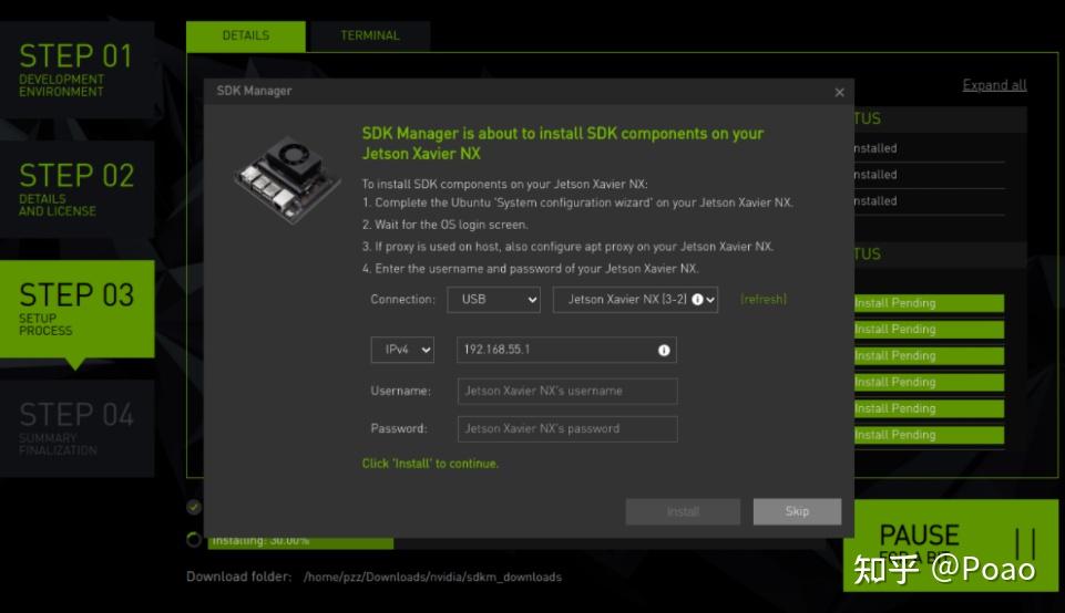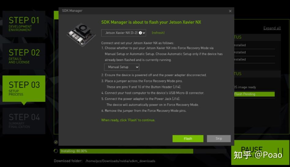 然后,短接前述【 FC_REC和GND 】两个引脚,并使用micro-usb连接xavier和Ubuntu系统,使用电源线给xavier供电。打开sdkmanager,登陆nvidia账号并选择自己的nx板(它会自动检测usb连接的nx板)。