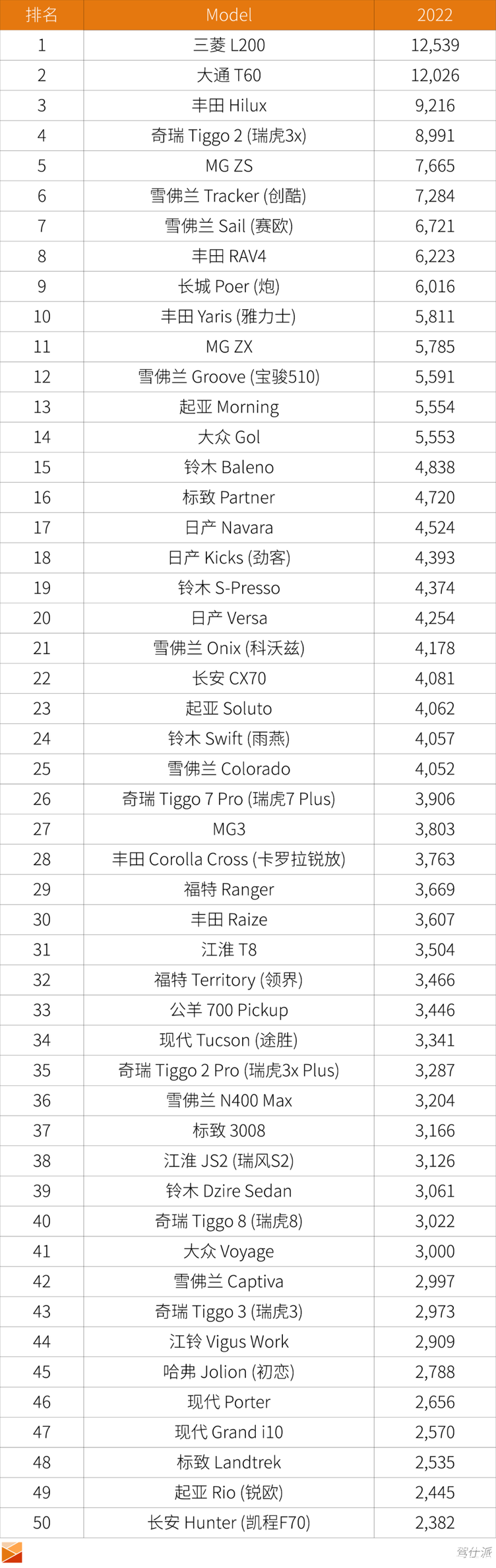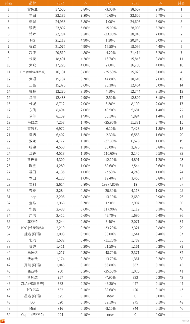 我们再来看2022年智利按车型的销售榜单: