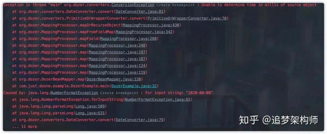 其次,由于我们 DTO 与 DO 对象中存在字段名不一致的情况,所以我们还在在转换方法上使用 @Mapping 注解指定字段映射。另外我们 createDate 字段类型不一致,这里我们还需要指定时间格式化类型。