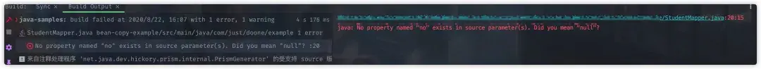 如果我们对象使用 Lombok 的话,使用 @Mapping指定不同字段名,编译期间可能会抛出如下的错误: