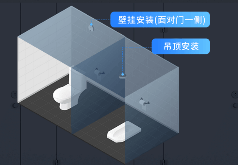星纵物联卫生间占用传感器可调节探头角度与设备安装角度设计,使得设备适用于不同类型的坐式和蹲式厕所;同时设备内置自标定算法,自动计算安装高度值,无需额外配置,降低部署难度。