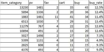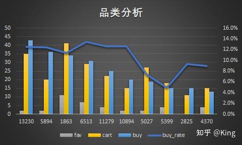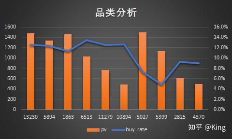 可以看到,其中’5027‘、’5399‘品类购买转化率较其余商品品类偏低(PV并不少),需要结合更多数据做进⼀步解读。可能原因:品类⾃有特性导致⽤户购买较低,⽐如⾮必需品、奢侈品等等。