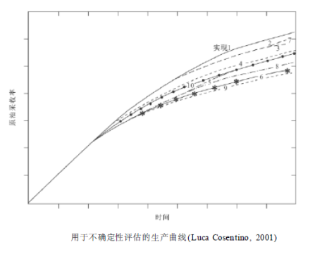 在许多研究中, 都要对与计算储量及生产曲线相关的总体的不确定性做出评价。从纯粹技术角度来看, 问题就会简化成为输入一些不同的参数, 建立一些模型, 而把每个参数变化所得到的结果作为一种参考, 这些参数值可能是乐观也可能是悲观的。通过这种方法, 就能产生一系列的生产曲线, 如图2 , 然后从这些曲线就可以计算出整体上的不确定性。无论如何, 要建立一个具有统计学意义的一套预测方案不是一件容易的事, 任何情况下,这都要看油田的开采处在那个阶段。