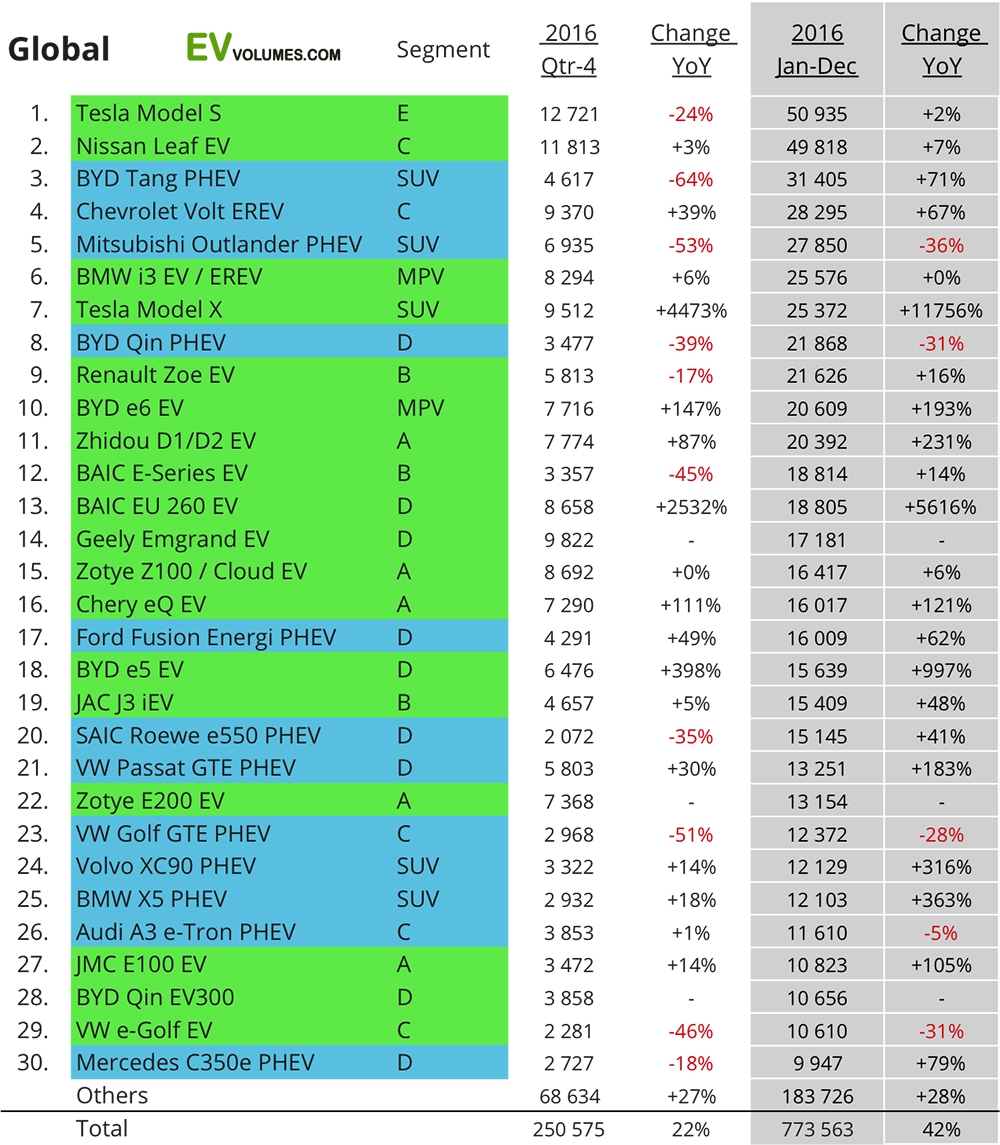 今年年初,EV Volumes 发布了 2016 年全球电动汽车、插混汽车销量排名,其中纯电动汽车年销量前十名分别是: