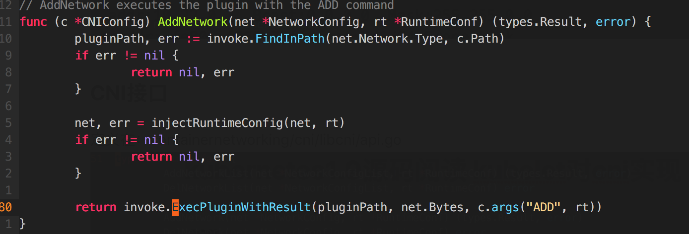 对于CNI接口,以AddNetwork()为例:先从pluginPath获得plugin的binary,然后injectRuntimeConfig()将网络配置注入到networkconfig中,并作为最后plugin执行的输入,然后还会将network的操作(ADD或者DEL)以及RuntimeConf,作为plugin执行时的变量;