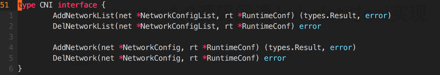 CNI接口定义在:containernetworking/cni/libcni/api.go,CNI接口包括如下几个方法: