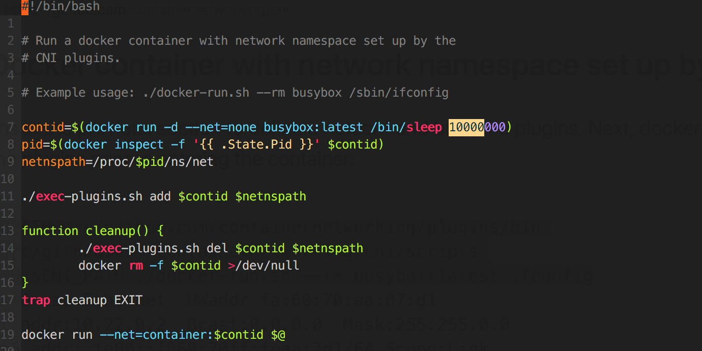 在CNI项目的README中,有如何使用CNI插件创建Docker容器的例子: