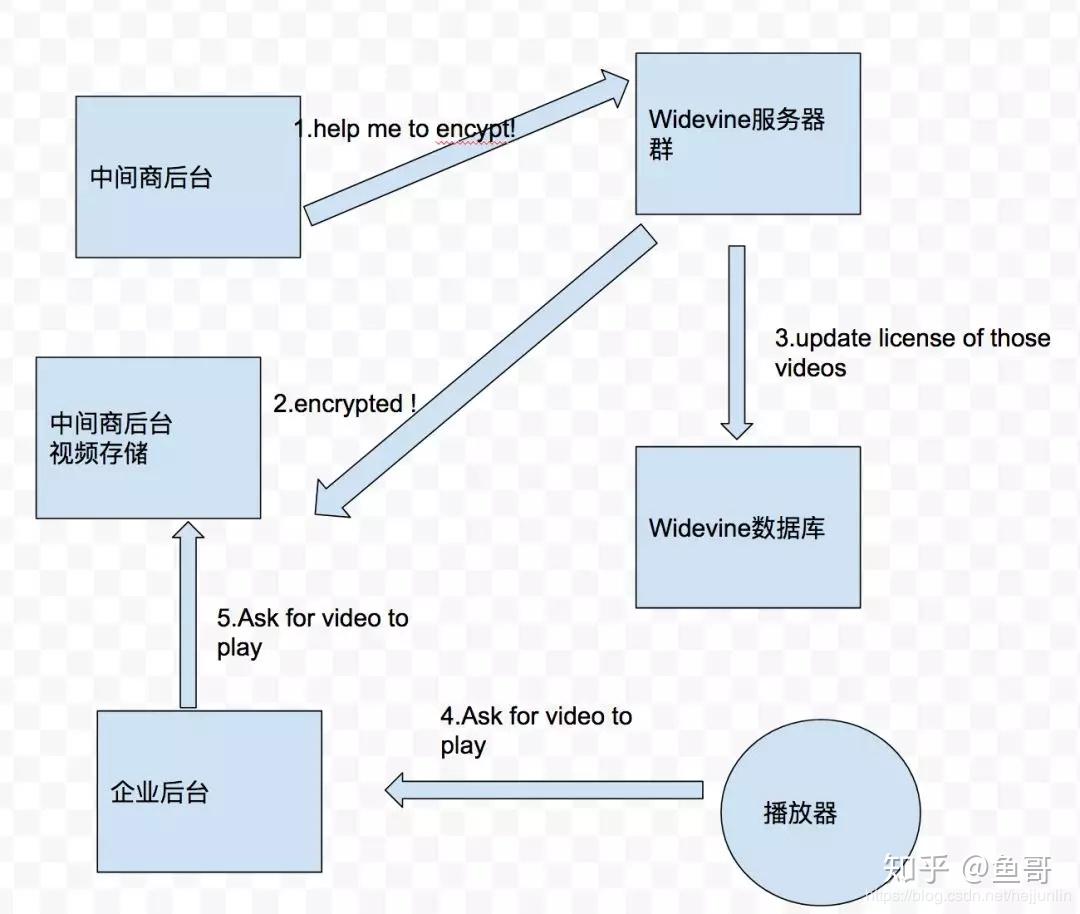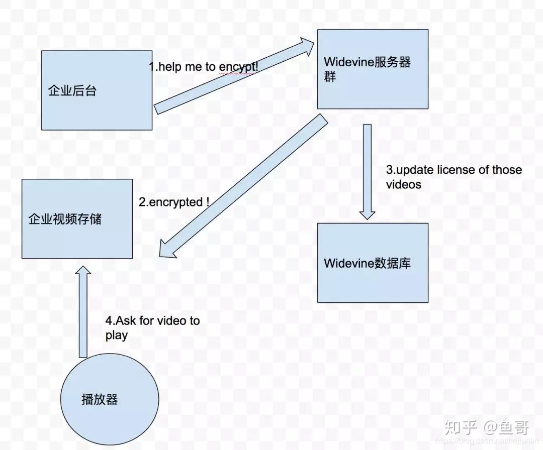 以Widevine的后台为例,widevine自从被google收购之后就将其后台发展为类似云平台的PASS服务了,企业的后台可以购买Widevine的服务,服务提供加密的API组还有数据库容量,用来保存企业视频的license,即解密秘钥。至于身份验证啊等等功能就留给企业后台自己完成。以下示意图可以大概解释一下Widevine的DRM流程