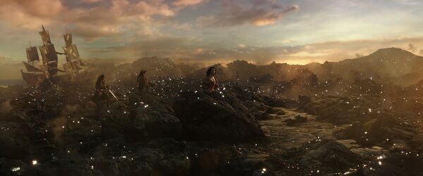 影片中,编剧们安排了海之女神Calypso来照顾海中亡灵,庇护海盗,女主伊丽莎白的父亲去世后,灵魂坐在漂浮的小船上去往阴间,幽灵船要在世界的尽头引渡亡灵。