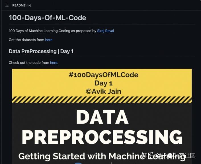 这个 repo 的名称是不言自明,它包含一个 100 天的学习 ML 计划。它来自一群开源爱好者的一些非常有价值的贡献,并且在 repo 中包含了数据集。该repo 的另一个显着特点是每天的图形海报,就像每日学习计划的摘要,如果打印的海报能激励你保持正轨,这将非常有用。